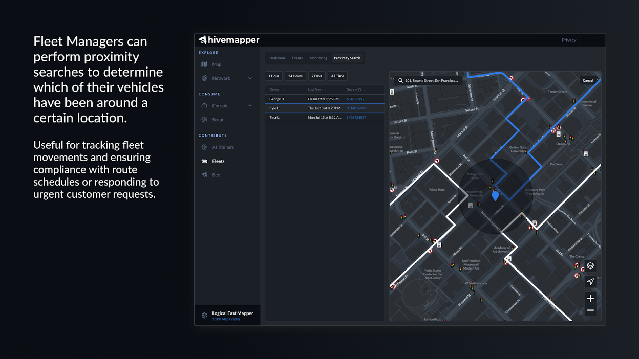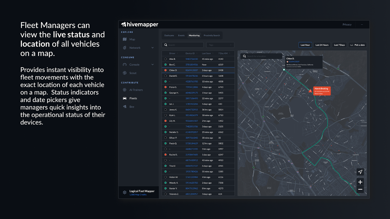 In the world of commercial fleets, each vehicle isn't just a set of wheels — it's a $75,000 investment on the road. And like any smart investor, you want to keep a close eye on your assets. That's where Hivemapper's monitoring tools come in. They're not just about tracking dots on a map; they're about transforming those expensive hunks of metal into data goldmines. Real-time location tracking isn't Big Brother watching; it's smart business keeping its finger on the pulse of operations.