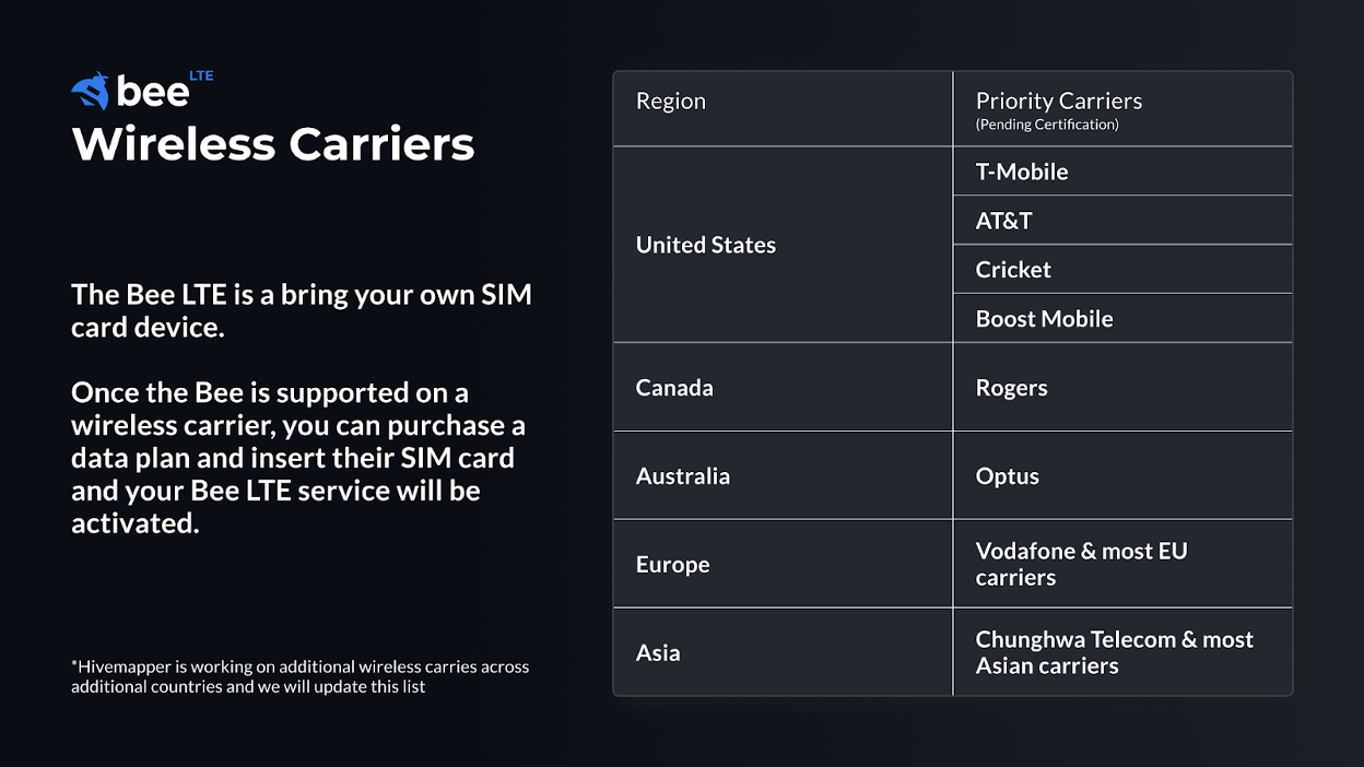 Whether you’re in the U.S., Canada, Australia, Europe, or Asia, the Bee LTE will support major certified carriers. As Hivemapper expands carrier support, your options will continue to grow.
