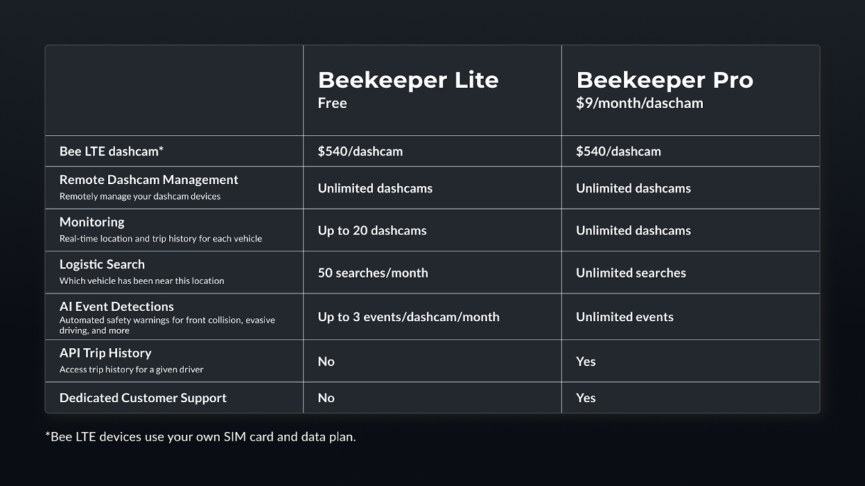 All Beekeeper plans require the Bee LTE dashcam and a data plan. See the next section for more details.