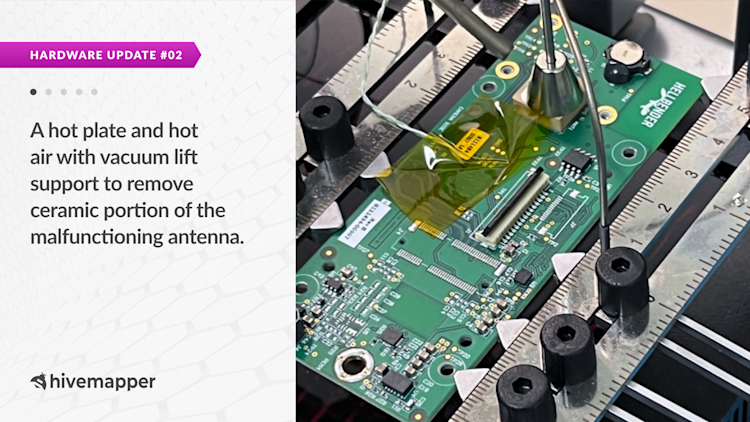 The GNSS antenna needs to be installed under certain reflow oven thermal conditions. Exceeding those conditions may damage the antenna component. To facilitate fast R&D, we used a rapid prototyping house. During our investigation, we uncovered that they didn’t follow the proper installation procedure for this antenna. The images below show the process we took to remove the damaged antennas and solder them again under the correct conditions.